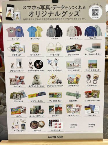 パレットプラザでは、スマートフォンやデジタルカメラのデータから写真プリントはもちろん、多岐に渡る「オリジナルグッズ」の制作ができます。また「フィルム現像」「証明写真撮影」「写真修復」「年賀状などのはがき印刷」「お名前シール&スタンプ」も承っております。