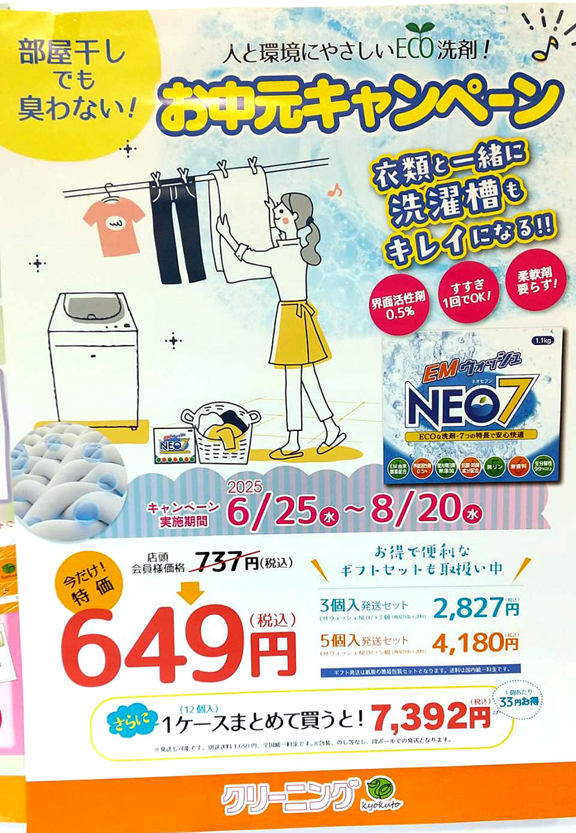 EMウォッシュNEO7(ネオセブン)は、従来のEMウォッシュのエコな特長に加えて、天然由来の抗菌・防臭成分がプラスされ、蛍光増白剤が無添加になりました!定価1,200円(税抜)のところ会員様640円(税抜)でお求めいただけます。