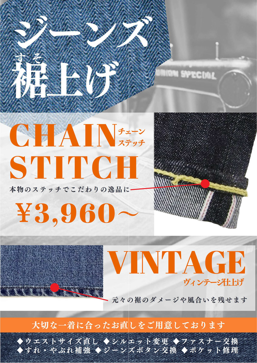 最短2週間、裾上げや修理などのリフォームもうけたまわります。詳しくは店頭まで。