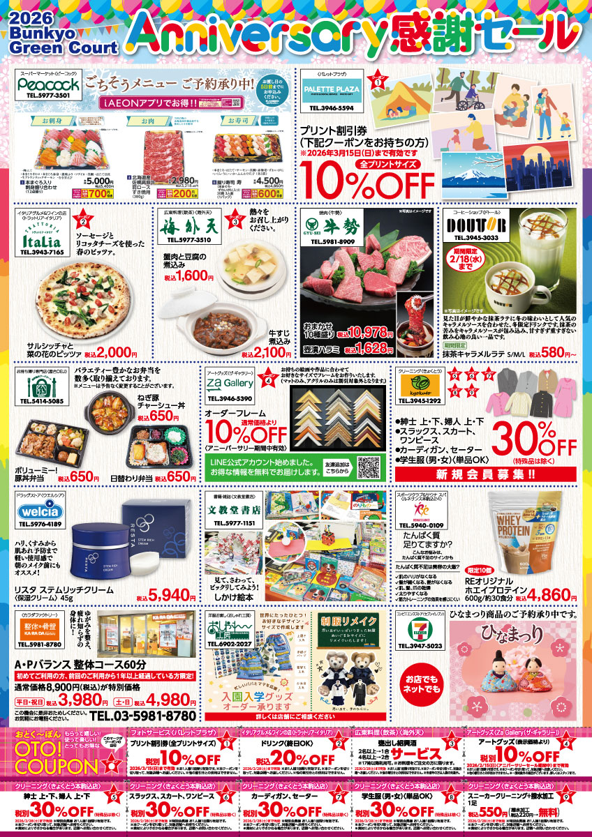 ※期間中、文京グリーンコート館内の各ショップとルネサンス本駒込24(屋台DELI、2Fカフェテリア、2Fカフェレスカ、2F未来ダイニングは除く)で税込3,000円以上お買い上げのレシートで1回抽選できます。